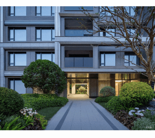 外立面设计以浅色香槟铝板线条、深色香槟铝板窗套搭配暖灰色真石漆,整体配色更具活力。
