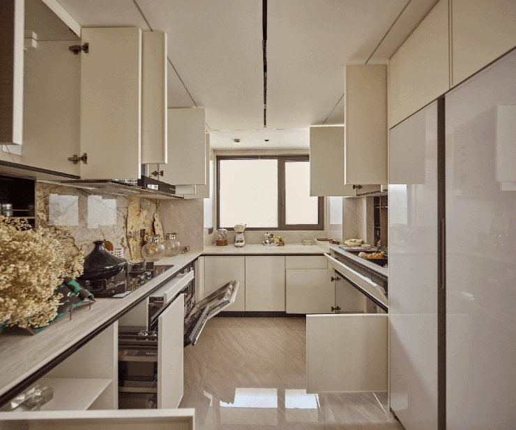 b.U 型厨房更创新采用上海首个高低台设计,既解决下厨弯腰痛点,三面台均分还能拓展操作空间。