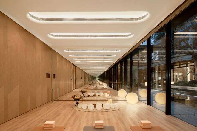 健身房的一大亮点是延续了项目对“她享主义”的设计,除了传统健身器材外,还打造了女性训练区,不仅设计风格更柔和,专属女性的拉伸区也更加复合女性健身习惯。