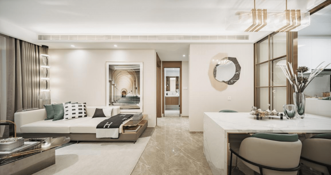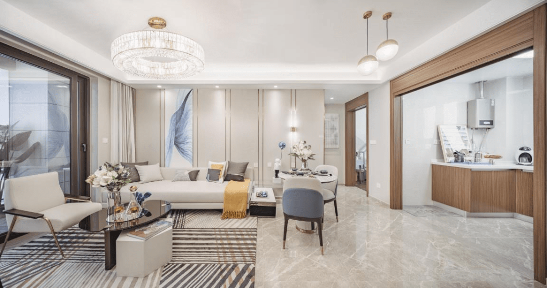 客餐厨一体化设计,外连景观阳台,保证室内充足的采光与通风,无隔断的设计,增加了空间使用率,也满足了家庭成员之间更多的互动与交流需求。
