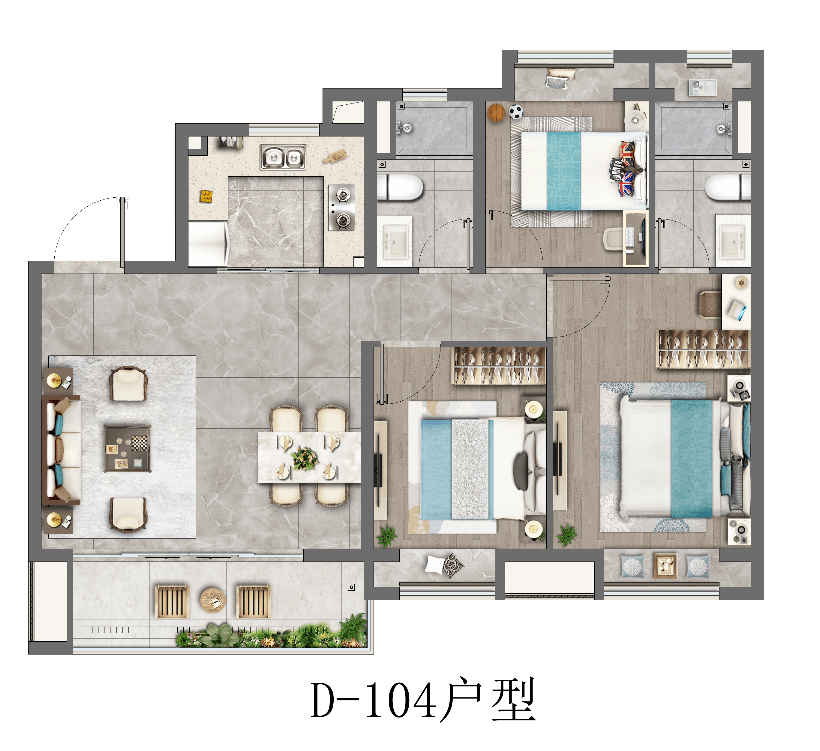 建筑面积约104㎡的3房户型,四开间朝南+主卧套房设计+全卧室带飘窗+南北通透+超大的宽面阳台,做出了拥有120㎡以上户型的尺度感和舒适度。如果预算合适,这个户型特别推荐。