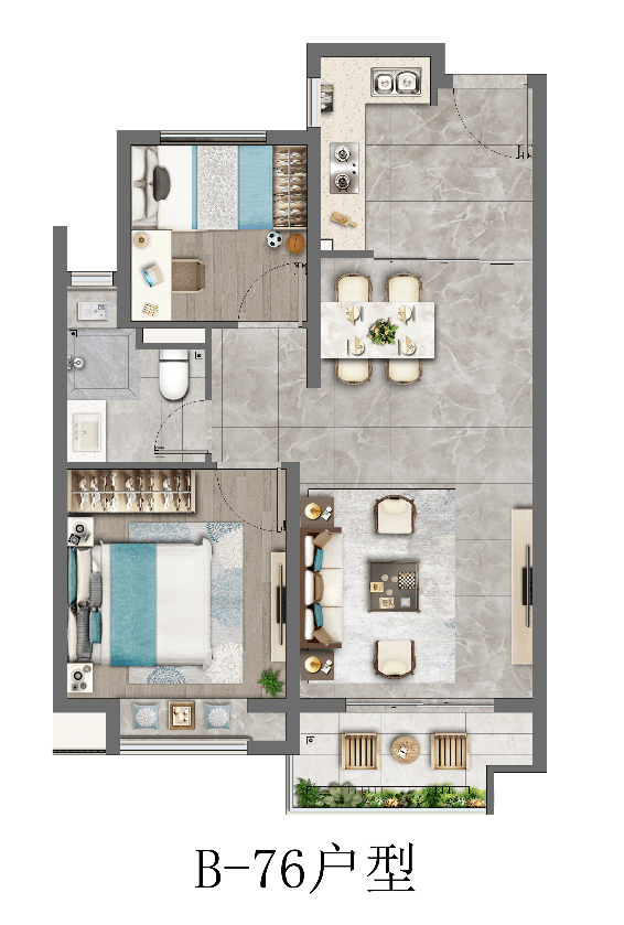 建筑面积约76㎡的两房户型,户型相当方正,也没有多余的走廊等空间浪费;客餐厨一体化设计,让视野非常的开阔;同时,双开间朝南的设计,保证了室内采光、通风的优秀。