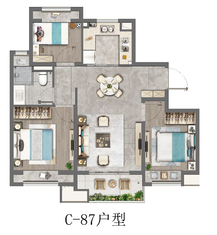 建筑面积约87㎡三房户型,可谓云湖壹号的“头牌明星”。三开间朝南,南北通透,所有卧室均带飘窗,不管是采光、通风、还是视野,这个户型都无懈可击。