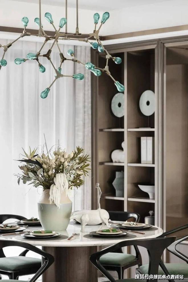 餐厅在整体设计上,沿袭了客厅的配色和风格,简约却又不失格调,尤其是山水墨画元素的融入,让用餐氛围更显温馨感.