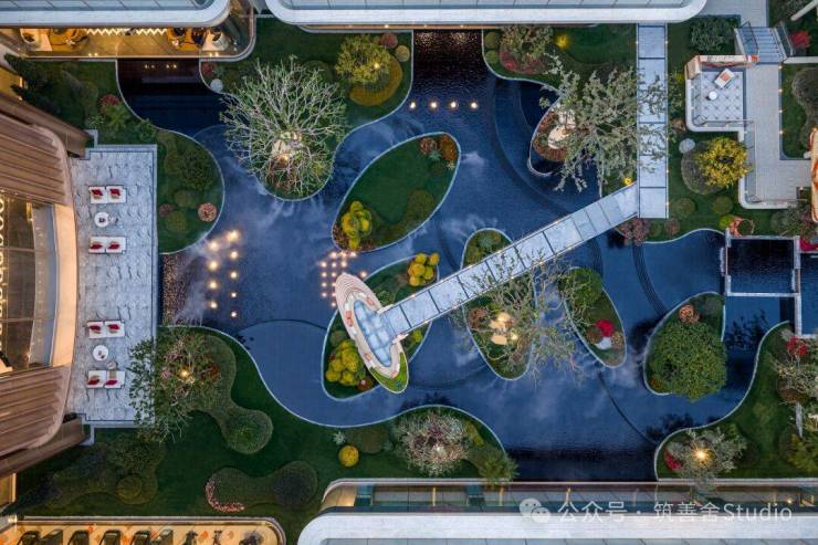 小区大门以“云扉初开”为灵感,打造具有仪式感的礼仪入口。宽约66米、高约8.6米的恢弘门庭,与酒店式归家大堂共同构筑,打造出极具仪式感的序厅,瞬间开启归家的尊崇心境。入口处精心打造的树阵水院,以静谧尊贵的氛围迎接归家。巧妙运用高差设计,通过层层递进的景观节点,优雅地引导业主步入社区深处。