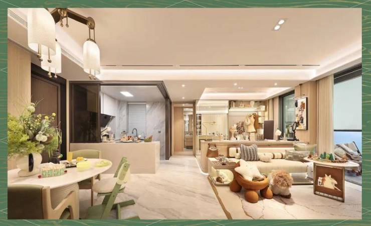 在精装修标准上,项目也是满格配置,比如中央空调,客厅岩板背景墙、墙面高档墙布;厨房老板三件套(燃气灶、油烟机、洗碗机)、可移动插座、多功能大尺寸水槽;卫生间方面,双智能马桶、暖风机、双面镜柜……