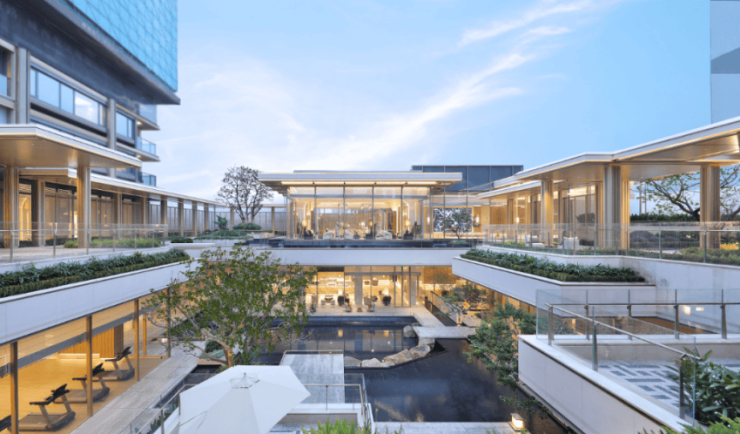 为满足杭州年轻一代的社交与休闲天性,融合交融、无界、立体等设计理念,精心打造仪式感入户门庭、立体式下沉庭院。中心泳池大花园围合布局,衔接多元主题泛会所空间,置身于对话自然的休闲场,自在畅游,松弛身心,都市人久违的度假感触手可及。