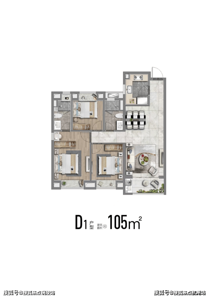 也有建面约113m²舒适性三房,南北通透;飞机户型,房间分列两侧互不打扰;卧室空间也相对更大、更舒适。
