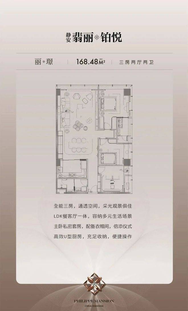 全能三房,通透空间,采光观景俱佳LDK餐客厅一体,容纳多元生活场景主卧私密套房,配备衣帽间,倍添仪式高效U型厨房,充足收纳,便捷操作