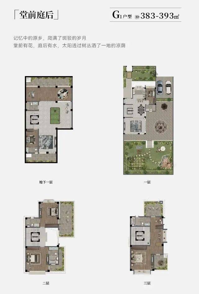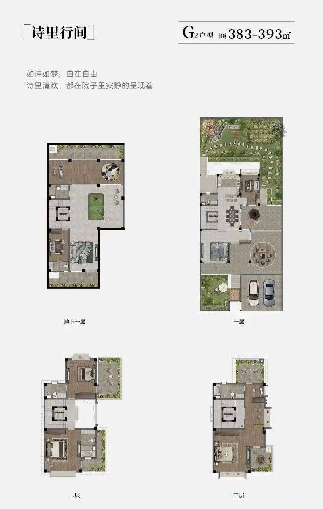 双拼别墅:南北双花园+独立车库设计,适合三代同堂居住。