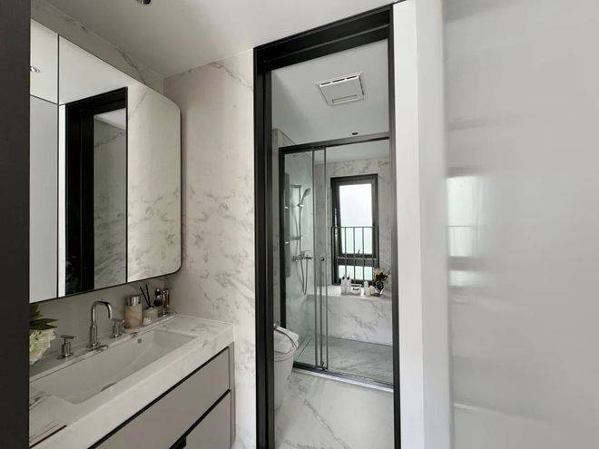 双卫配置,其中一个做了干湿分离,科勒台盆+双智能马桶+高仪花洒,除雾镜柜均内置了牙刷消毒器、预留吹风机插座。主卫镜柜还有美妆冰箱,收纳空间相当充足。