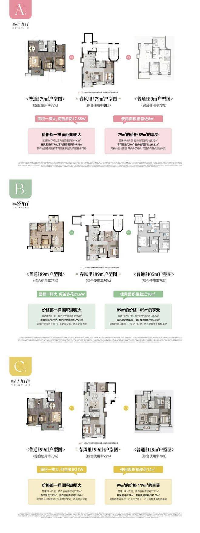 户型方面,春风里紧跟新规后户型迭代潮流,深度融合超维空间、创新S墙、LDK一体化设计等前沿空间营造理念,全户型平均实际使用率高达90%左右,远超市场平均水准,性价比不言而喻!