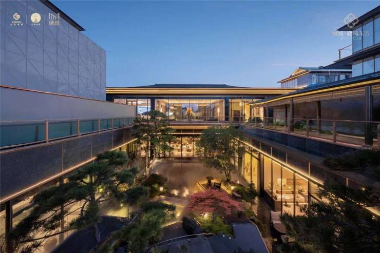 将视线延展,整体构成一幅融贯宋式美学的立体画卷:门庭两侧,两株特选古松苍劲挺拔,以傲然之姿守卫着这处昆山地标门户的庄严气度。