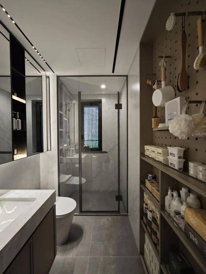 另外,在卫生间部分,项目在台盆对面做了一个墙体的向后延伸,再次做出一个超大尺寸的洞洞墙板和储物柜,原本只有镜柜的收纳空间瞬间就扩大了不止一倍。