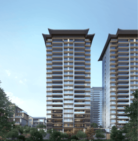 采用建发标志性中式设计,如53米宽歇山顶门庭、抬升式园林(高层整体抬升4.7米,二层相当于传统四层高度)。