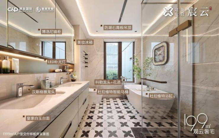 具体在餐客厅地面大理石、客厅背景墙大理石,以及大金中央空调,这是限价时代很难用到的,博世的内嵌冰箱也在交付标准,卫浴也全面升级。