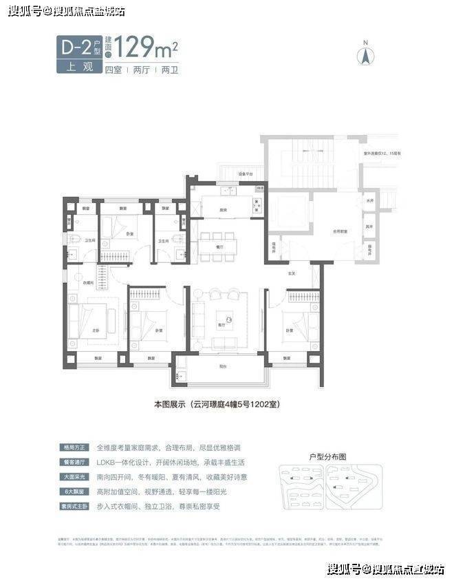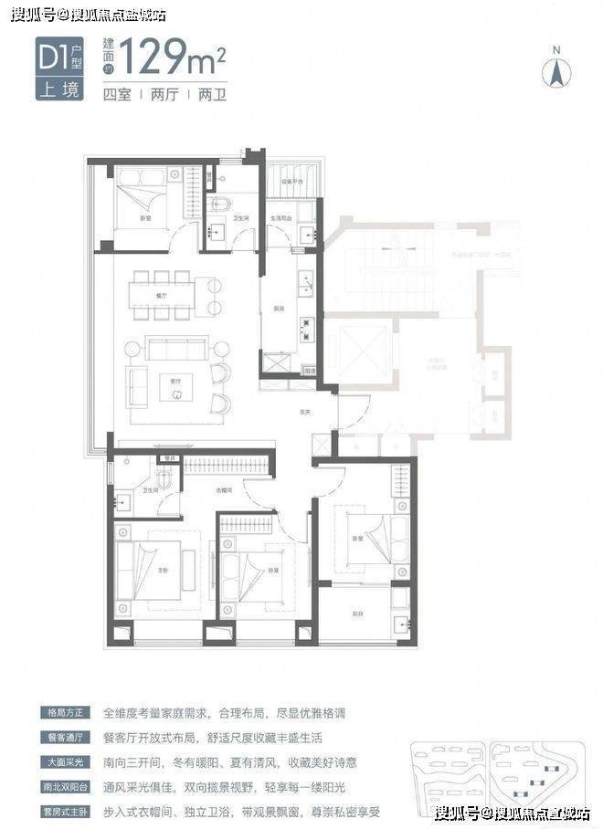预算充足的小伙伴,可以选建面约129㎡4房,经典的三卧朝南、边套观景户型。
