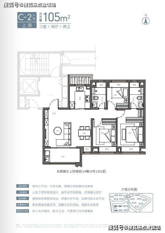 U型厨房、餐厅、客厅、阳台一线联通,南北通透。主卧套房、全卧飘窗、次卫干湿分离也都是标配。