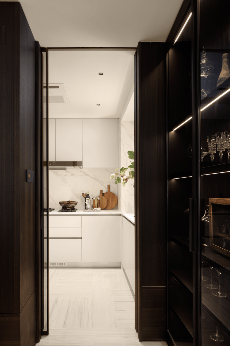 厨房区域采用了自由开合式设计,推拉门能够灵活开启或闭合,增强空间的交互性,里面的厨具都是嘉格纳和高仪等市场一线品牌。