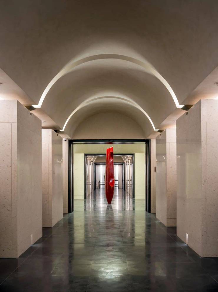 二楼的接待大厅,一尊拔地而起的红色雕塑,其顶部向上挑空到了三层。整个厅堂,都将不定期的进行展品更新,艺术气息浓郁。售楼处电话:400-880-7190