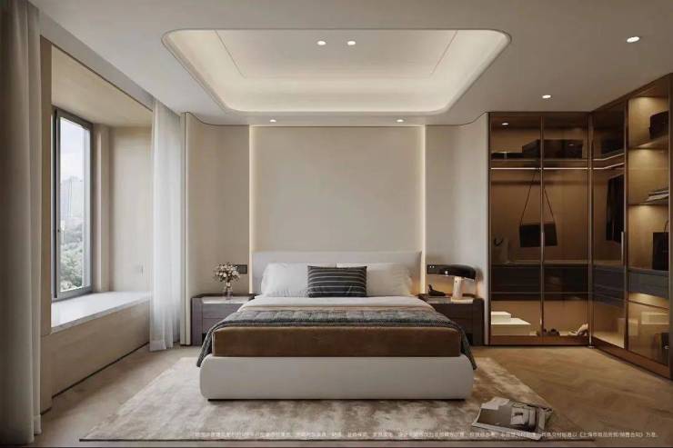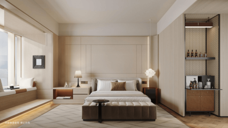 卧室部分,每个居室都有大飘窗+约270°弧形转角阳台,更加高效地利用空间以及阔绰的视野享受。