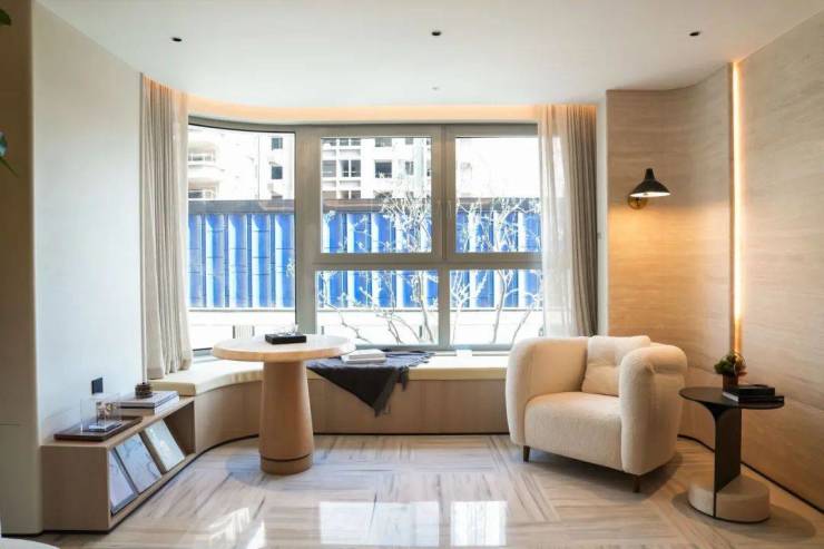 采用大量弧线工艺,包括转角玻璃阳台、弧形铝板、墙面线条和大门线条等,致敬了邬达克装饰艺术派的设计美学。