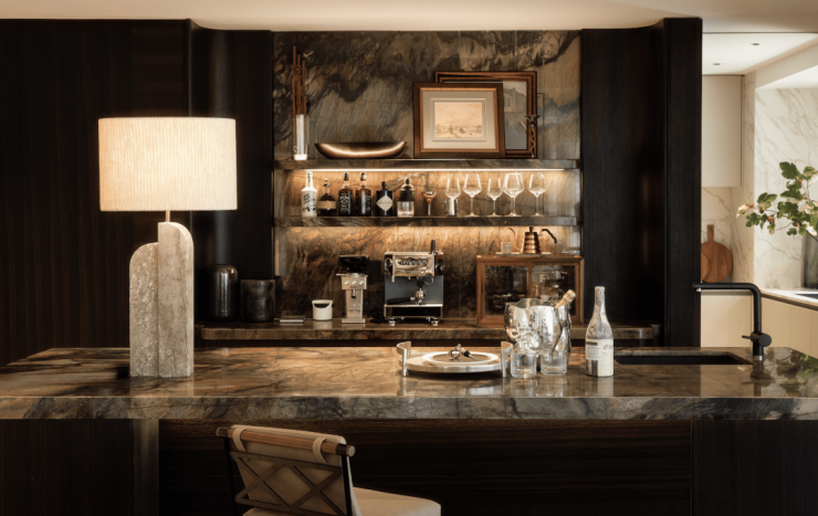 餐厅打造尺寸为约1.2米*1.5米的岛台,材质是天然奢石威尼斯棕,也是交付标准!