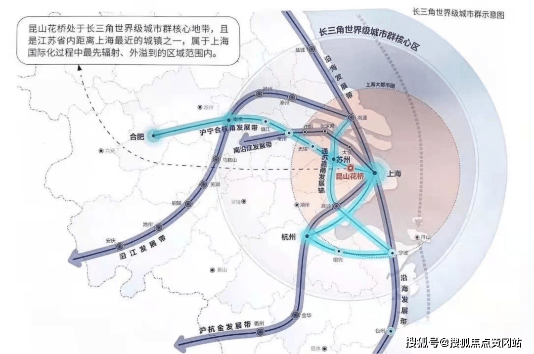 2021年2月,在国务院批复的虹桥国际开放枢纽“一核两带”功能布局中,昆山被纳入以虹桥商务区为起点延伸的北向拓展带。