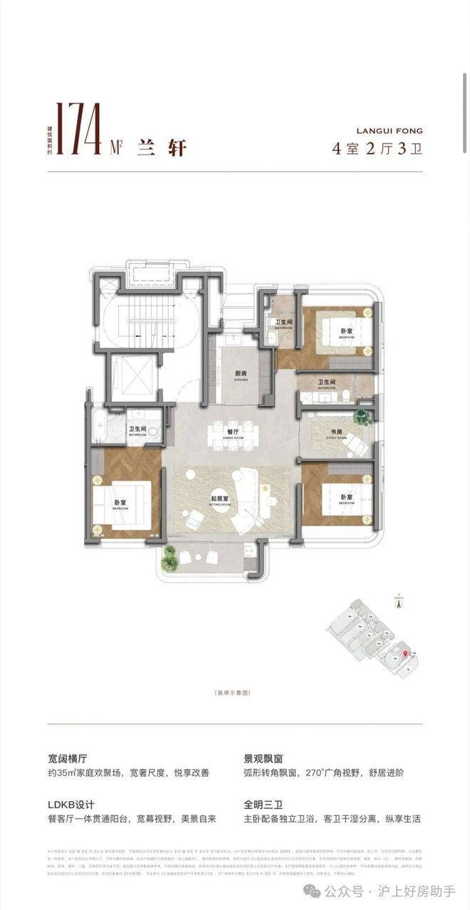 此次开放的户型为建面约198m²4房2厅3卫风貌平层,海派法式风设计,整体设计汲取了上海城市的在地性,将现代法式生活方式与海派文化融合于此。