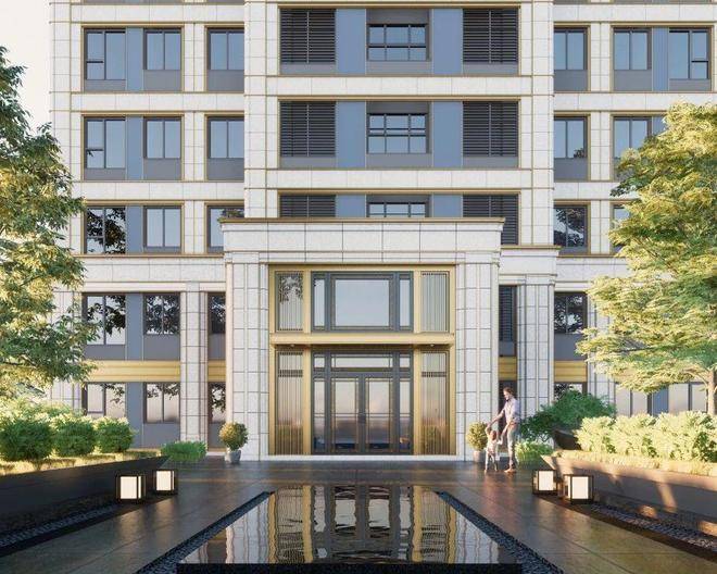 入口中轴对称式的前厅水景,两侧阵列由榉树围合组成,不仅拥有“门前中举”的美好寓意,也让入口的仪式感拉满,与灵动的喷泉水景交相辉映,形成具有东方礼序的归家体验。