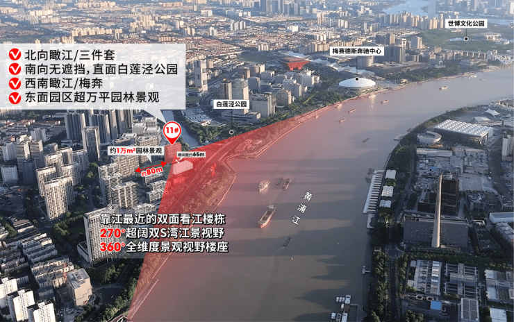 ② 360°全维度景观视野楼座:北向瞰江/三件套、南向白莲泾公园、西面瞰江/梅奔、东面园区超万平园林景观!