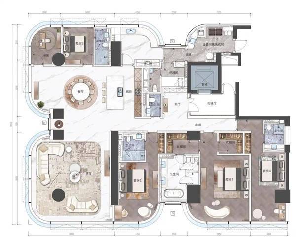 顶豪大平层:主力户型375平方米,赠送面积后实际使用达475平方米,得房率93%,层高3.8米,配备嘉格纳厨电、劳芬卫浴等国际一线品牌。910