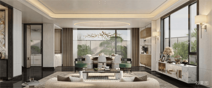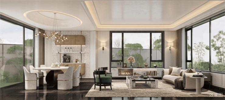 客餐厅、南向次卧、独立主卧层层配享同等尺度面宽,充分将全天日照最大限度地纳入室内。巨幅落地玻璃窗如同取景框,将庭院绿意无缝衔接入内,最大化确保了每位家庭成员都能平等地享有阳光与观景的权利。