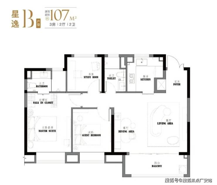 建面约107㎡户型 3房2厅2卫建面约107㎡整体布局与B户型基本一致,最明显的感觉是在尺度上进行了升级。比如横厅,由约5.3米升级至约5.5米,当然阳台和其他功能间也进行了相应的尺度升级。