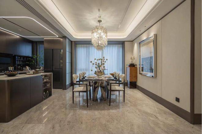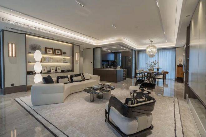 比如采用了摩根声光电全屋智能、厨房博世洗碗机和冰箱2件套、老板旗舰款的油烟机燃气灶以及蒸烤一体箱;卫浴是科勒、高仪、唯宝等大牌,配有美妆冰箱和智能马桶等,符合精英的生活需求。