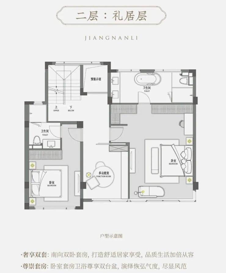 产品户型设计延续江南里经典格局,确保每一户都能实现“室室见景,生活融于自然”。建筑立面采用金镶玉形制,辉映披檐挂落,再现宋代建筑的清雅风骨;室内空间则引入现代宽厅设计理念,实现传统美学与现代生活的完美融合。