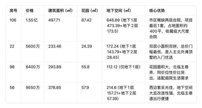 高拓展实用空间:主力户型建面300/380/500㎡,在售面积230-680㎡,实际使用面积最高达1500㎡,独门独户设计+私梯入户,每户配独立门牌号,圈层纯粹(主力客群为高净值人群),部分户型增设南院,预留个性化改造空间。