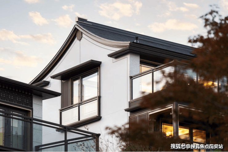 新中式,院墅,中式的坡屋顶与通透的大玻璃立面结合,将东方的传统意境与国际化的审美融合,像极了当前的杭州也像极了此刻的龙坞,既老又新,既传统又现代,既有西子湖的温婉又有钱塘江的磅礴,碰撞出一种全新的审美与生活方式。溪映听庐隆起的屋脊,仿佛群山的绵延,大地与人文交织出全新的风景。