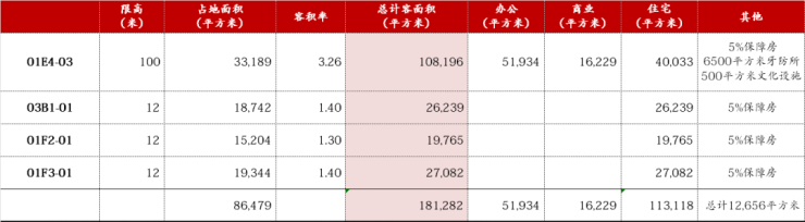 地块总占地面积33189方,容积率3.26,总建面176334平方米,地上计容建面108196平方米,地上不计容建面8704平方米,地下建面59434平方米。