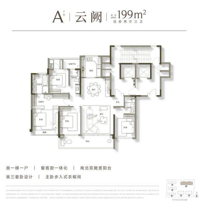 户型方面,高层建面约199㎡户型分A、B两种类型,类一梯一户,含赠送得房率约85-86%左右。