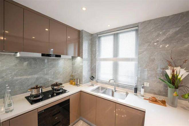 U型厨房,三面环形的台面,洗涤区、烹饪区及操作台等空间划分明确,既满足了使用空间的需求,又减少物品拿取往复的时间。