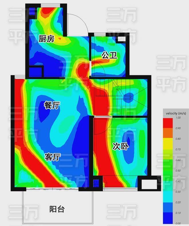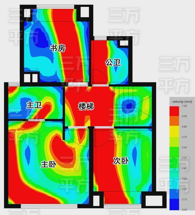餐厅北侧有开窗,具备了南北通风的良好条件,下图是模拟在春夏季东南风的环境下,户内的通风情况,颜色代表风速,红色最优,蓝色基本静止,箭头代表流动的方向。由图所知,主要房间的通风情况都很好。