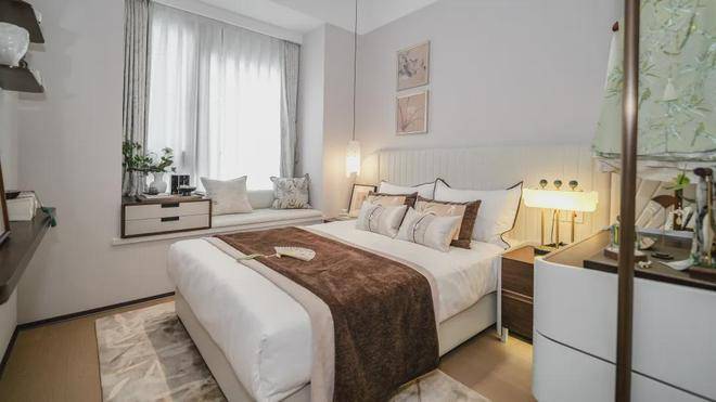 南向卧室附赠大面宽飘窗,推窗即见私属小花园,带来良好的景观视野。飘窗可打造成茶台,为生活带来多元化体验。