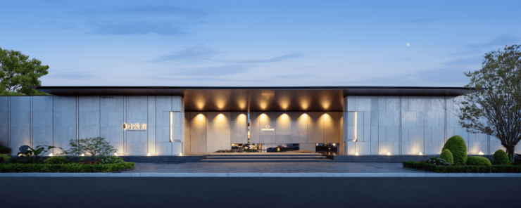 与会所一体的下沉庭院更是与周边建筑融为一体,静水流深,古树浮桥,自然错落的景观搭建营造了充满度假感的社区一角。