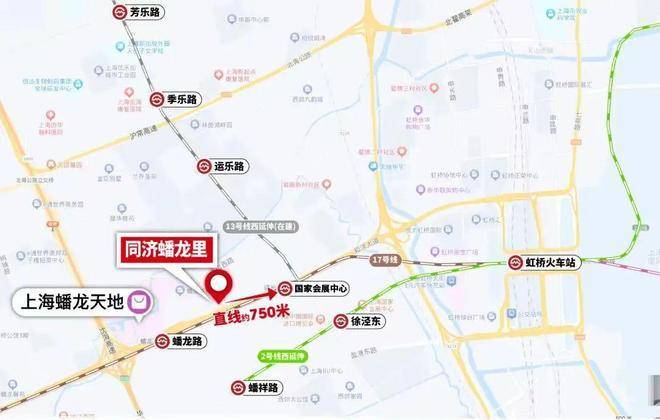 同济蟠龙里距离17号线蟠龙路站/国家会展中心站步行约750米,整个虹桥虽然新房众多,但真正能称得上步行直达地铁站的轨交盘,寥寥无几。