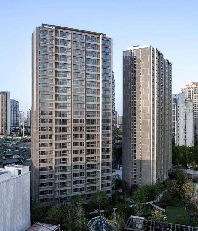 立面材料选取稍显沉稳的“皇室啡”花岗岩,其特殊的颜色与纹理,既能与北侧的办公统一色调风格,也能和周边现有的高容积率建筑,以及绿树成荫的街道环境融为一体,呈现低调精致、简洁大方的高品质住宅形象。