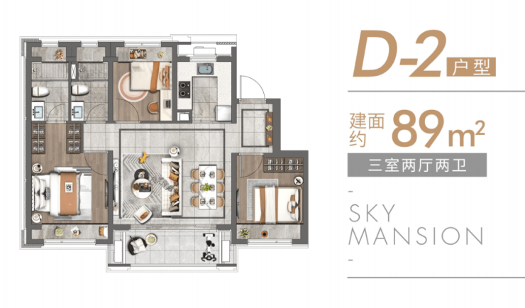 3房2卫的户型,能满足业主从二人世界到一家三口,再到二胎家庭的全生命周期需求。