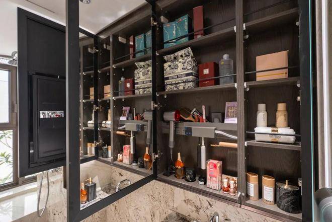 卫生间镜柜,同样是交付标准,内外双镜打造,主卫配置美妆冰箱,可用来收纳业主的面膜、化妆品等,设计贴心。