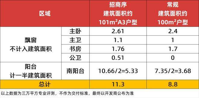 通过专业测评还可以看出招商序的不计入建筑面积的部分有整整11.3㎡,相当于多出一个房间,针对百平三房这样的紧凑型户型来说,性价比真的很高,实际居住体验也会更舒适!