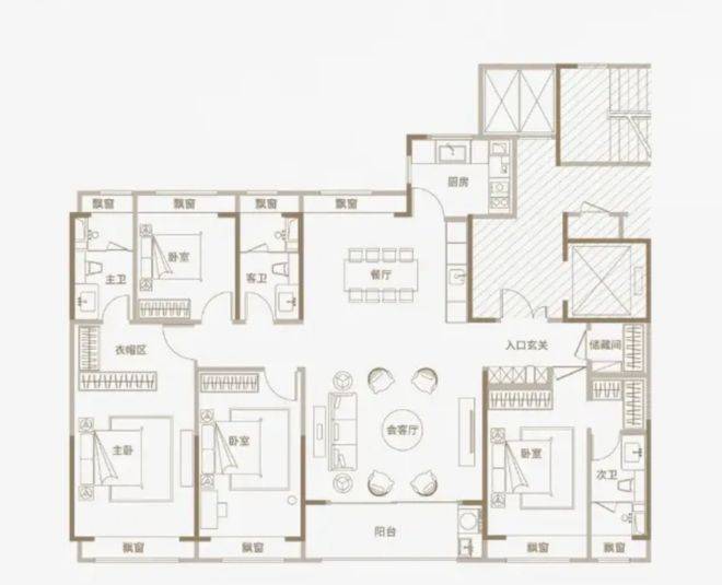 要知道,现在市面上的主流做法,是把三房的各个功能空间,都做飘窗设计,以得到更开阔的景观视野,并增加实际面积使用率。